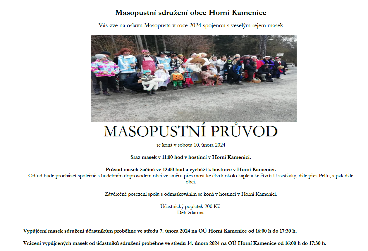 Sraz masek v 11:00 hod v hostinci v Horní Kamenici.